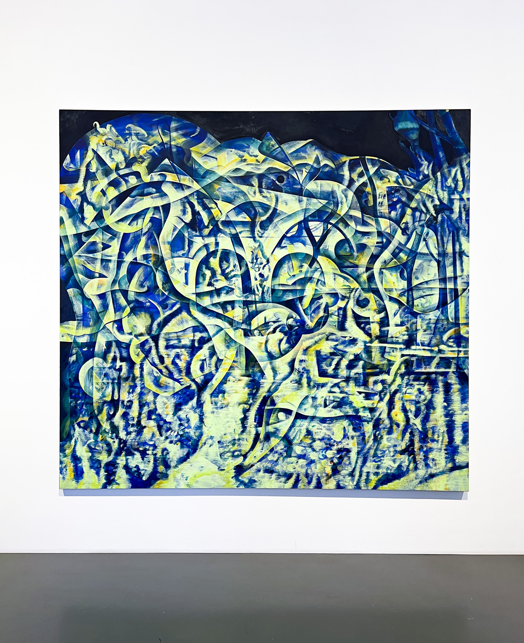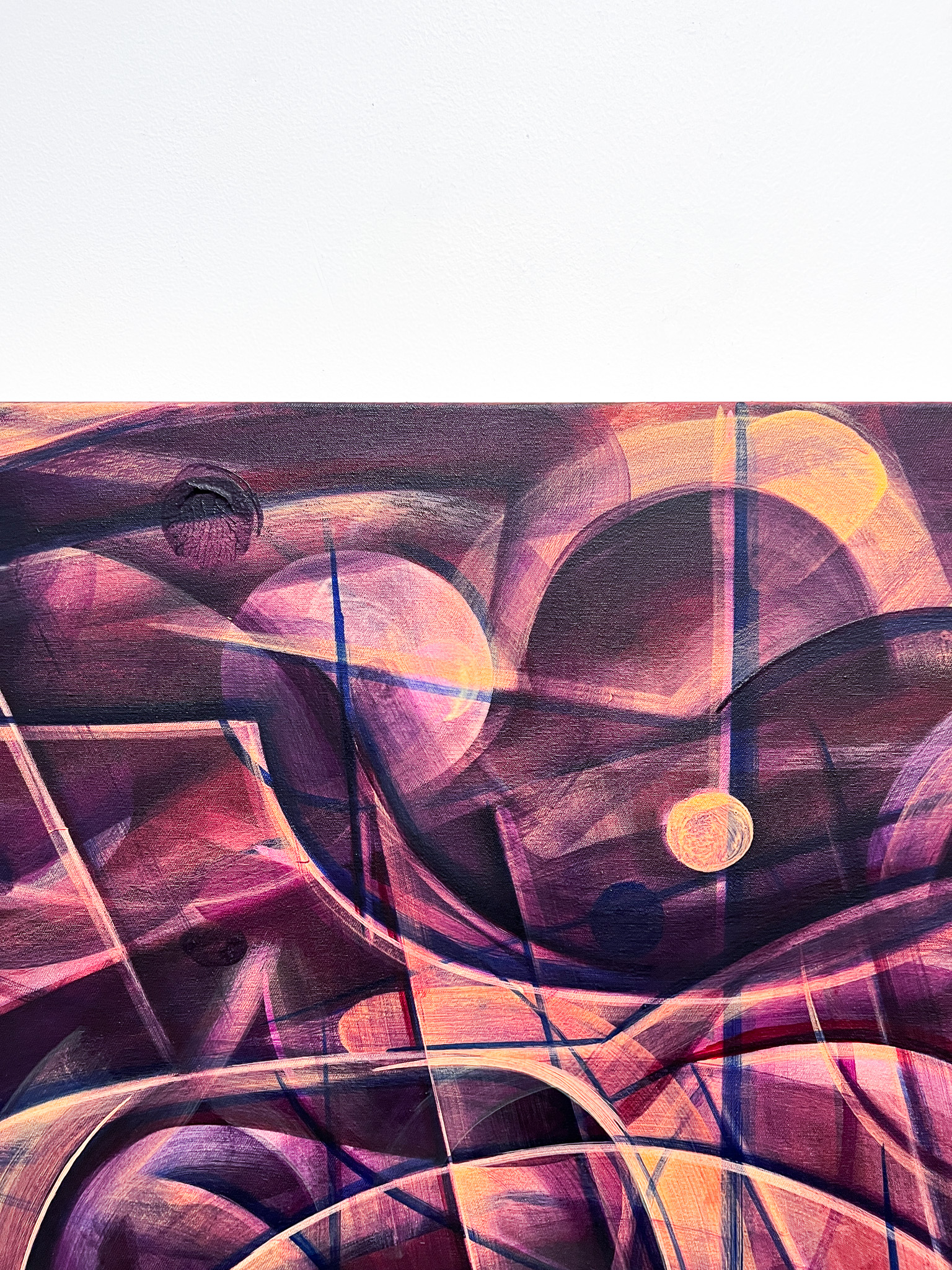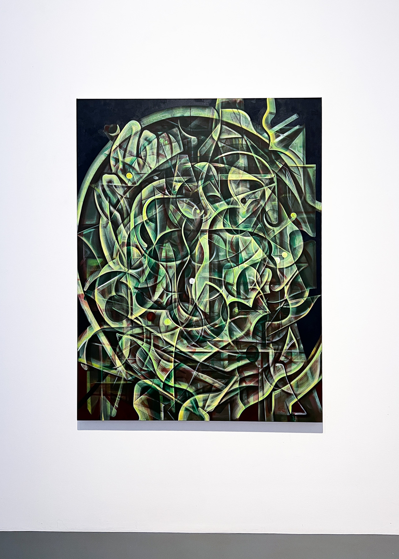 Anton Linds måleri förenar struktur och dröm. I verket Folds with one hour möts digital tidtagning och målerisk tradition; suddiga siffror och veckliknande linjer anspelar på vanitasmotivet och tidens förgänglighet. Genom att måla i minutintervaller överlagras bilderna till täta, abstrakta ytor – en metod med konceptuella rötter hos Sol LeWitt. I Gateways flätas fluorescerande färger och naturformer samman till visionära portaler. Linds verk rör sig mellan abstraktion och dröm, där lager av bilder framträder som minnen ur ett förlorat medvetande.