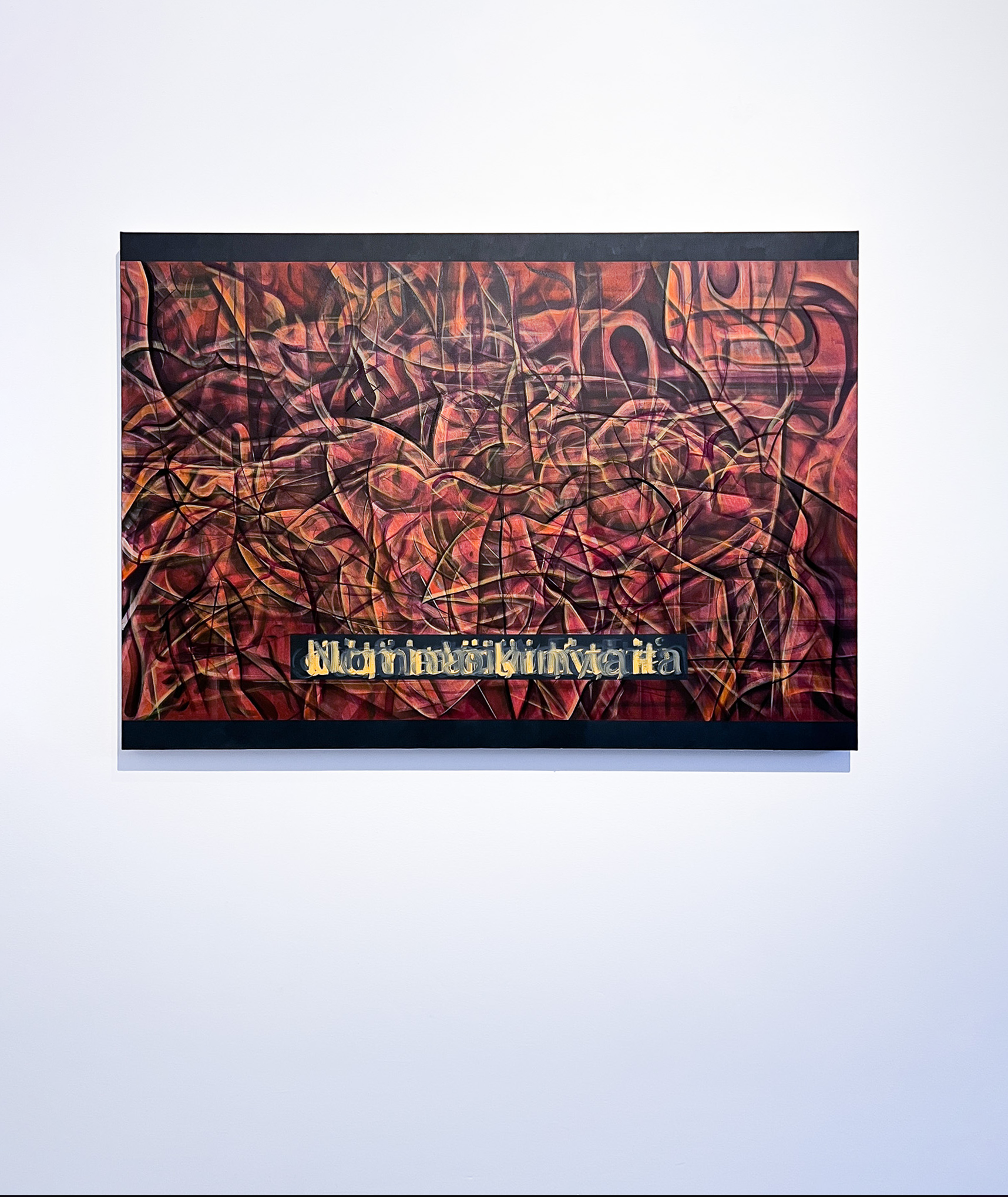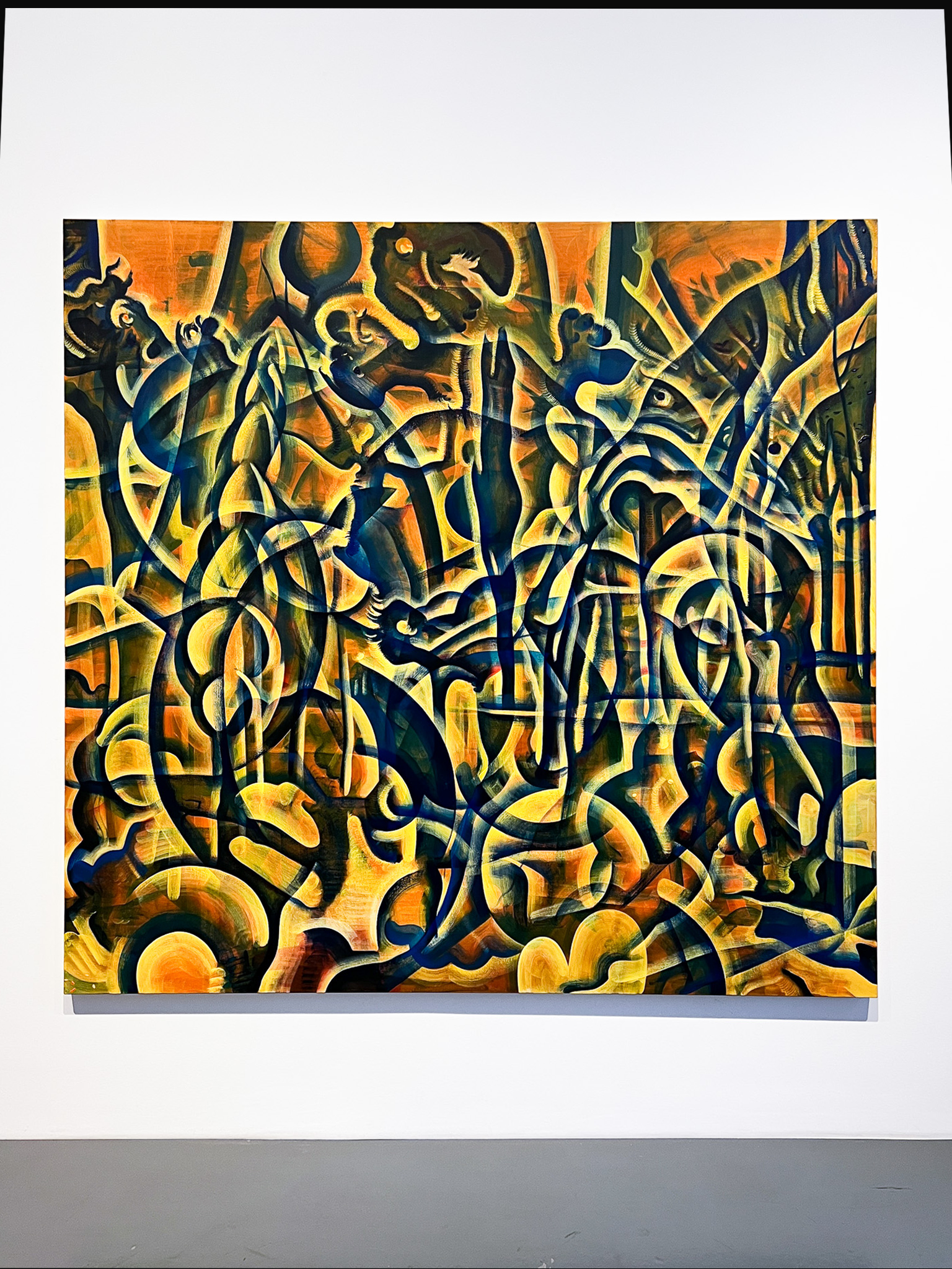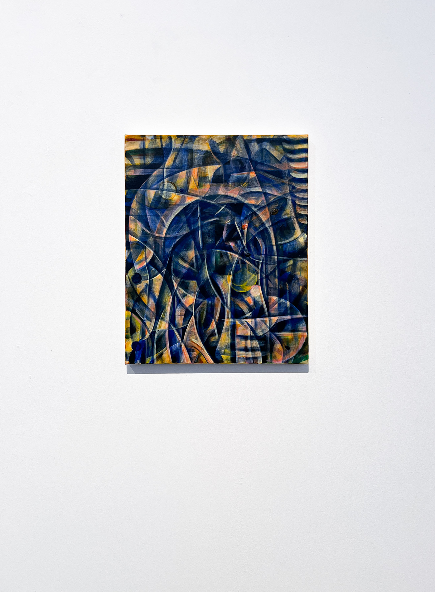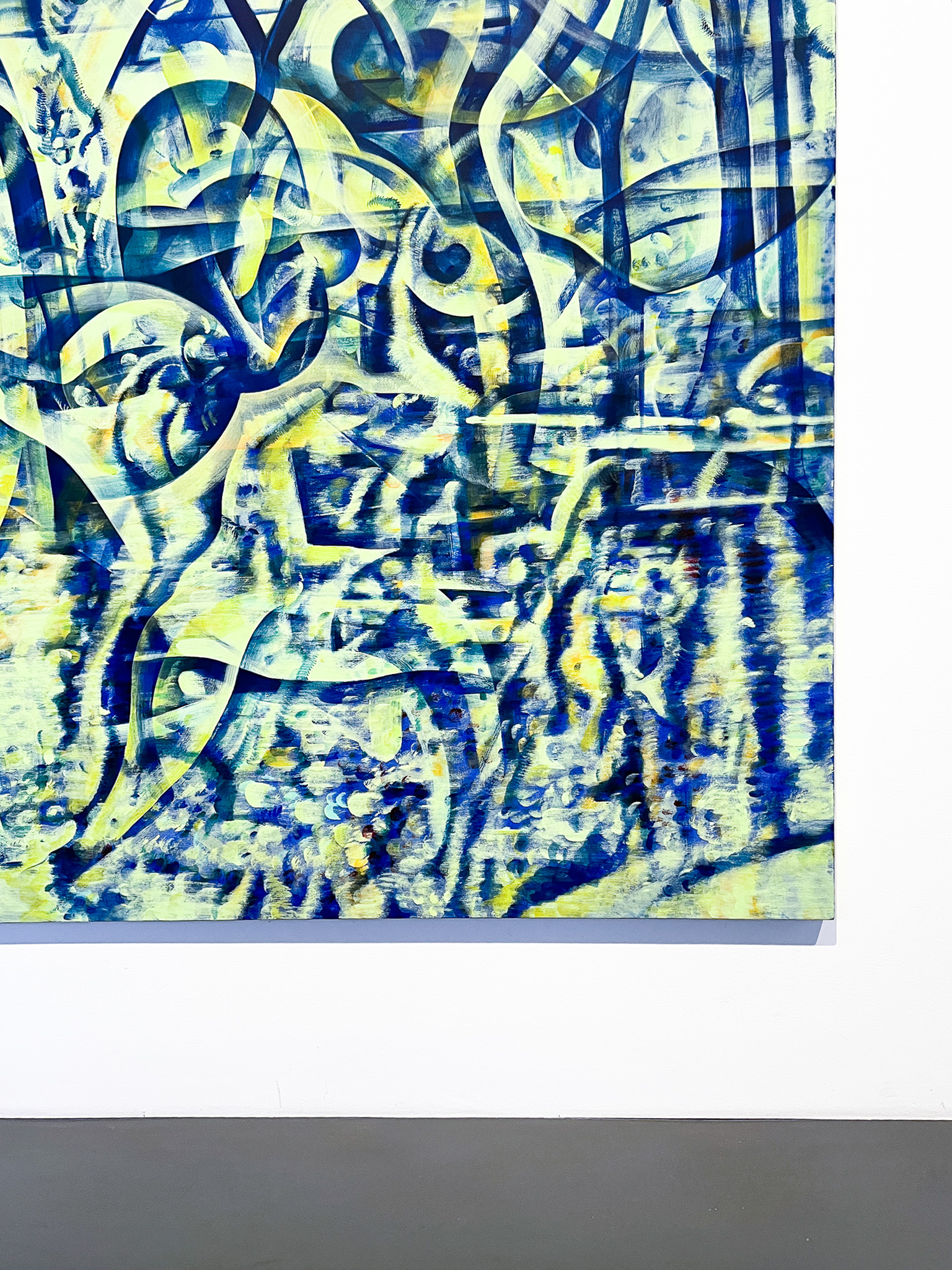 Anton Linds måleri förenar struktur och dröm. I verket Folds with one hour möts digital tidtagning och målerisk tradition; suddiga siffror och veckliknande linjer anspelar på vanitasmotivet och tidens förgänglighet. Genom att måla i minutintervaller överlagras bilderna till täta, abstrakta ytor – en metod med konceptuella rötter hos Sol LeWitt. I Gateways flätas fluorescerande färger och naturformer samman till visionära portaler. Linds verk rör sig mellan abstraktion och dröm, där lager av bilder framträder som minnen ur ett förlorat medvetande.