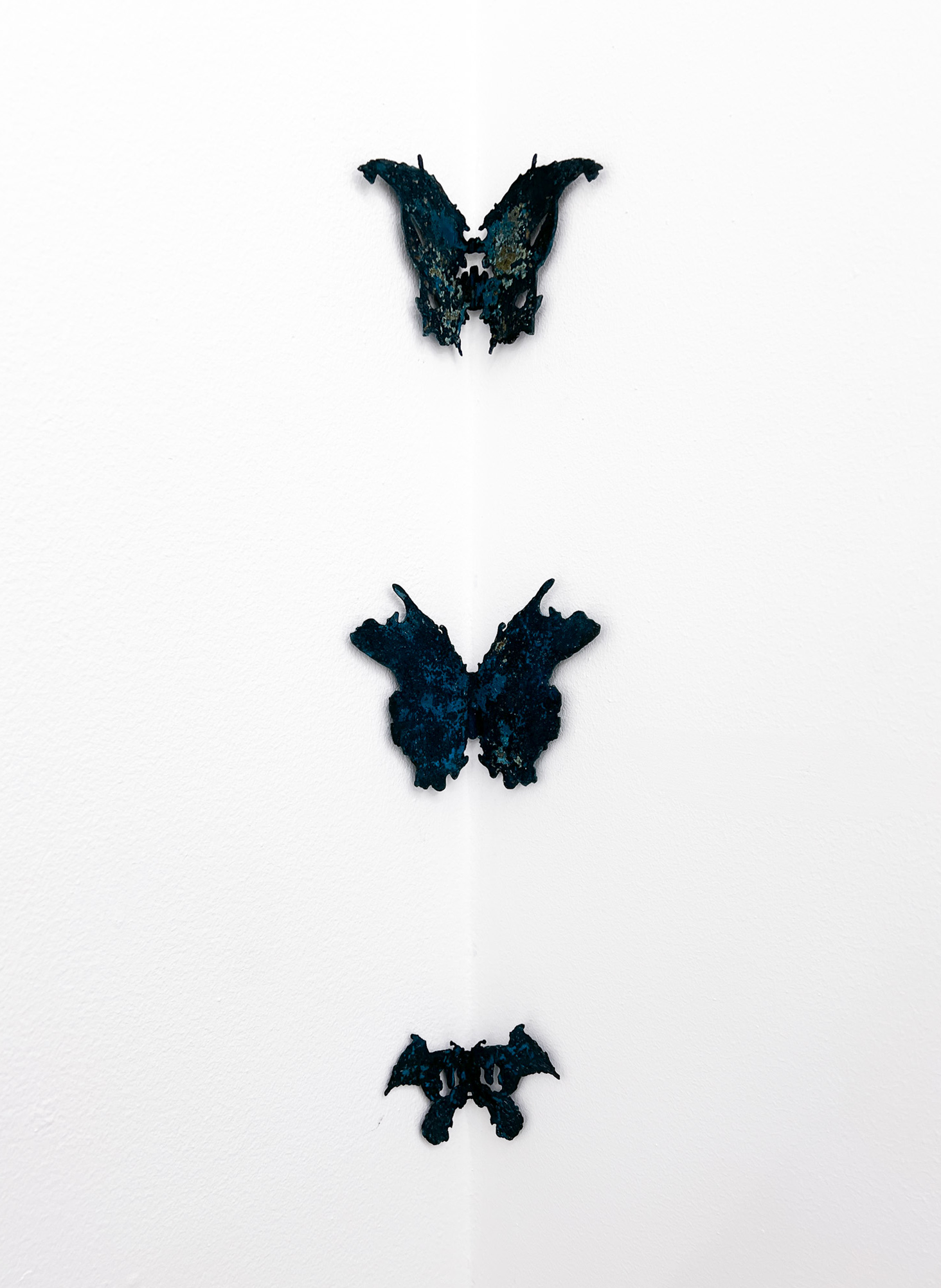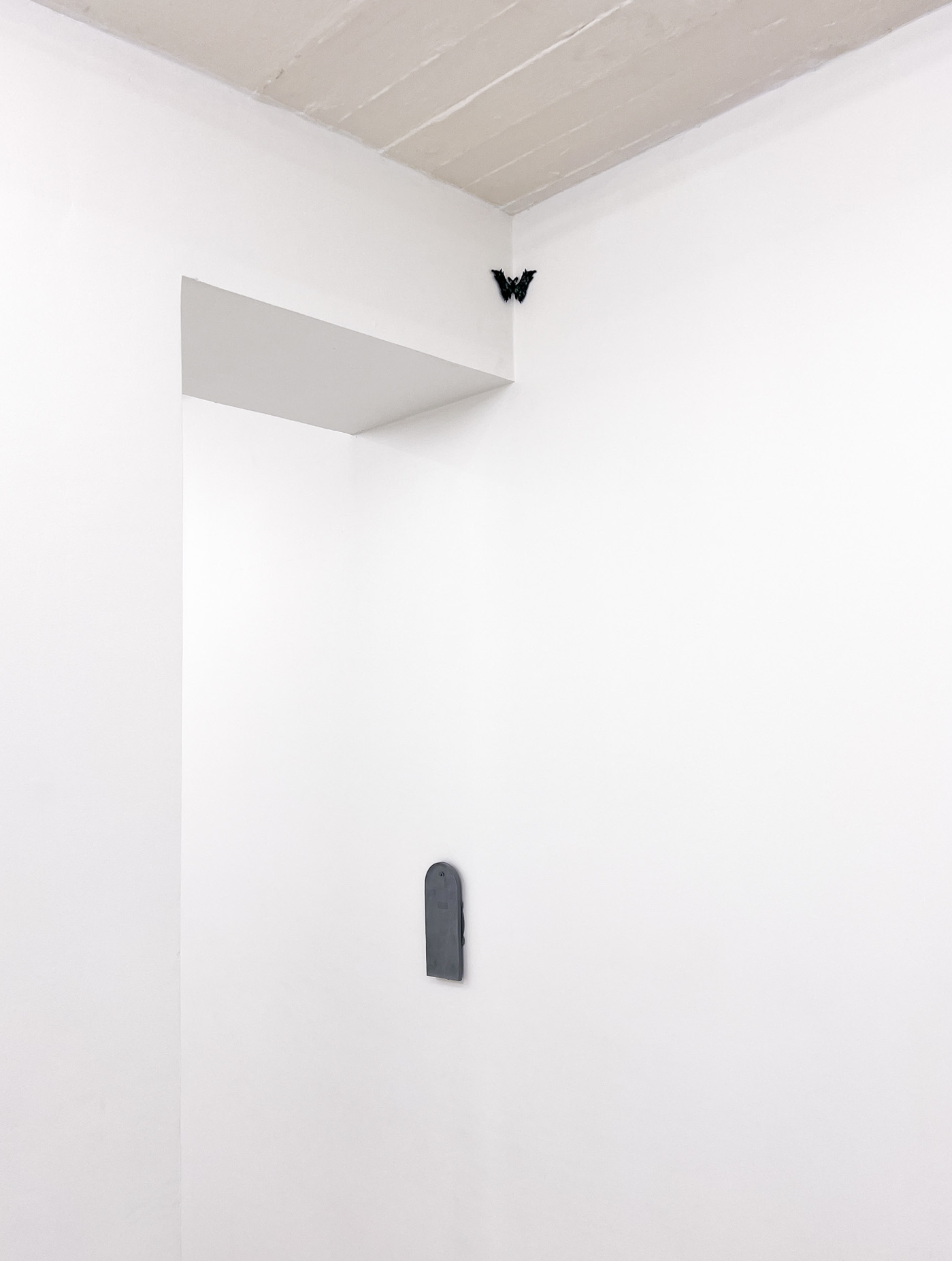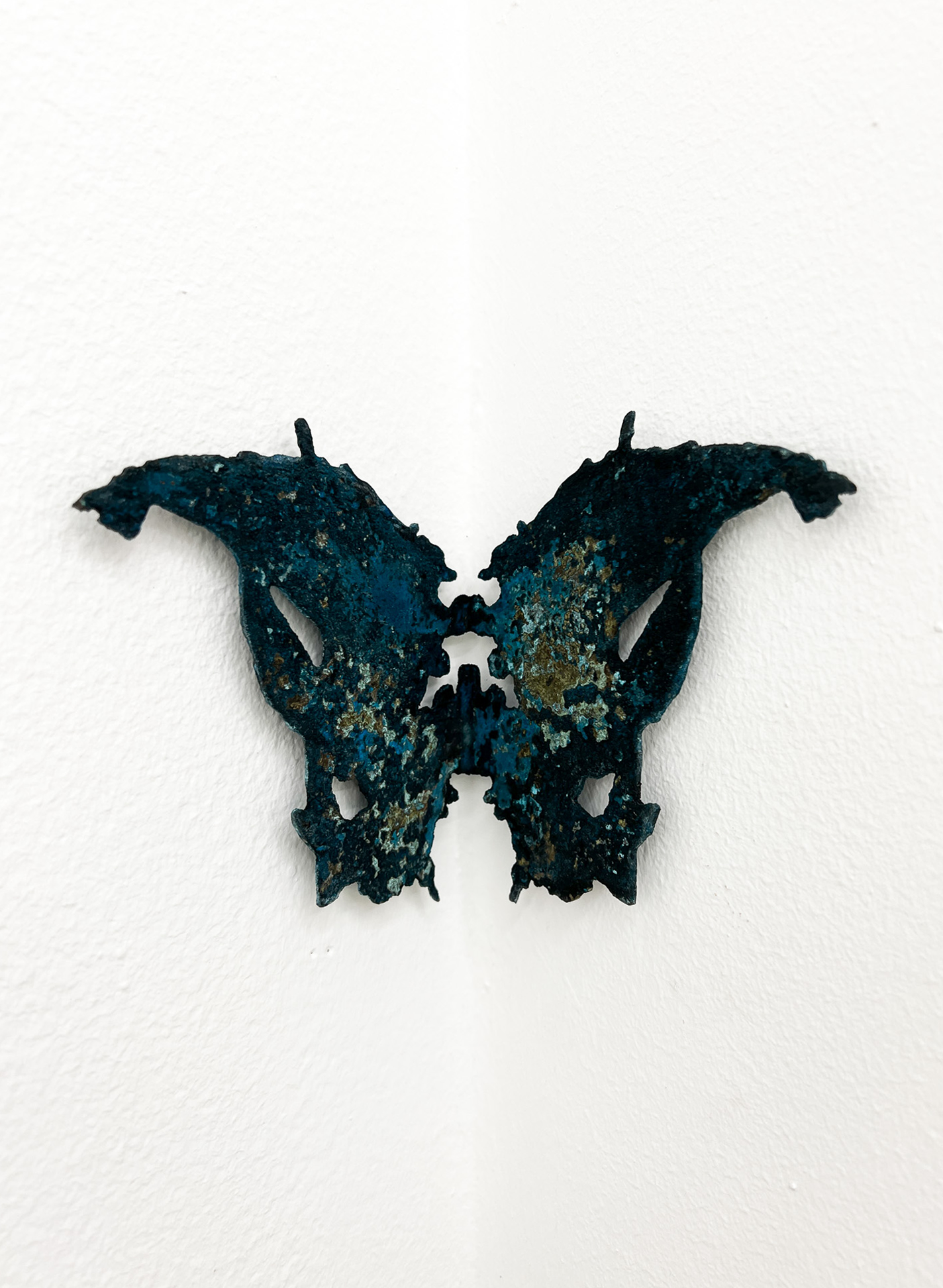 Christofer Degrérs första soloutställning på Coulisse Gallery, “incense, smoke, perfume, coffee, onions, alcohol, and the sea”, tar sin utgångspunkt i ett fragment: en telefonbild på en boksida med en lista av dofter och smaker. Utställningen rör sig kring fragment och brist, där rosor, stjärnor och fjärilar återkommer som tecken på det förlorade och det flyktiga. Med återkommande motiv, speglingar och språkliga skiftningar utforskas närvaro genom frånvaro. Instabilitet fungerar här som metod—konsten pekar mot helheten genom att visa på dess avbrott och brister.