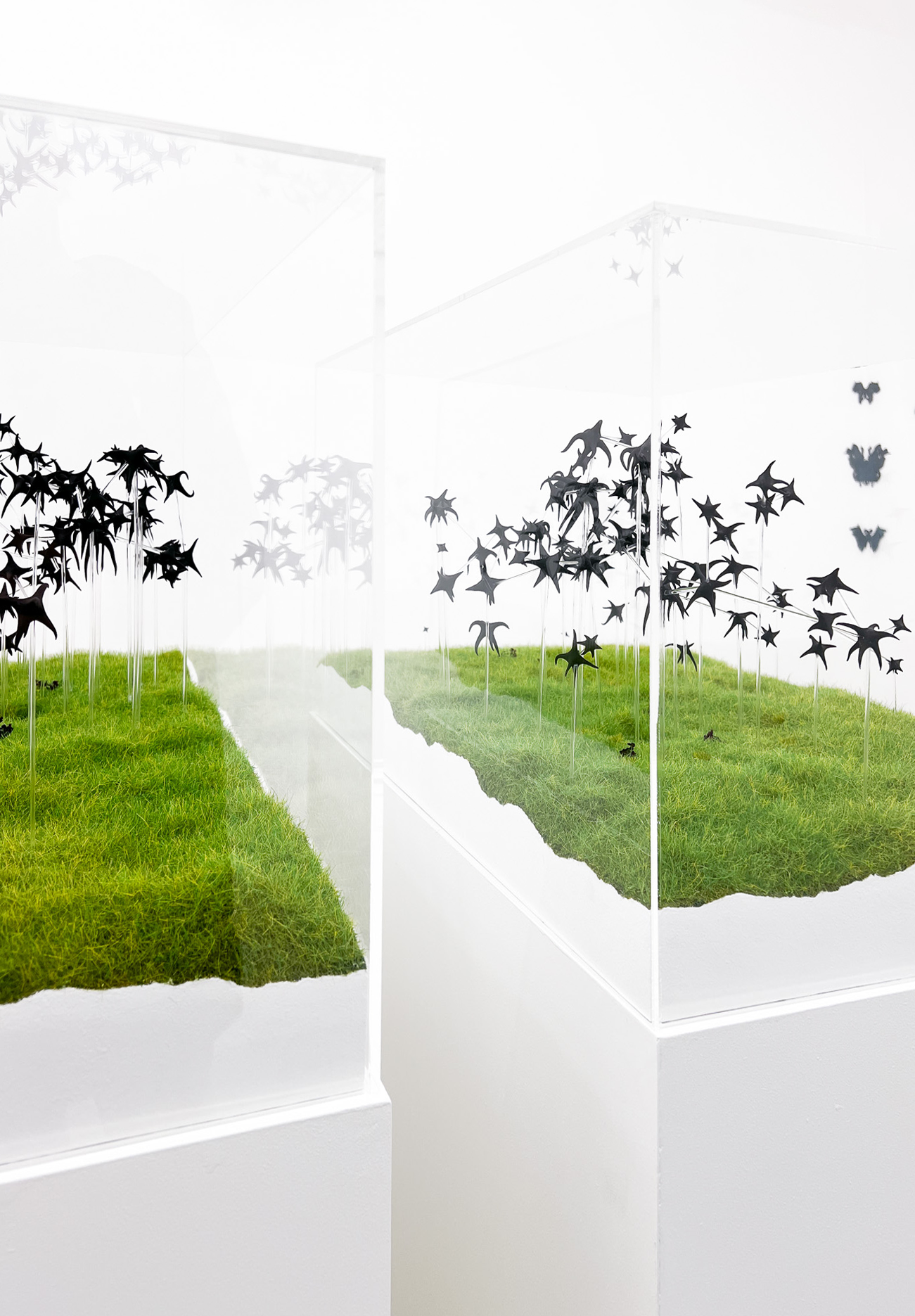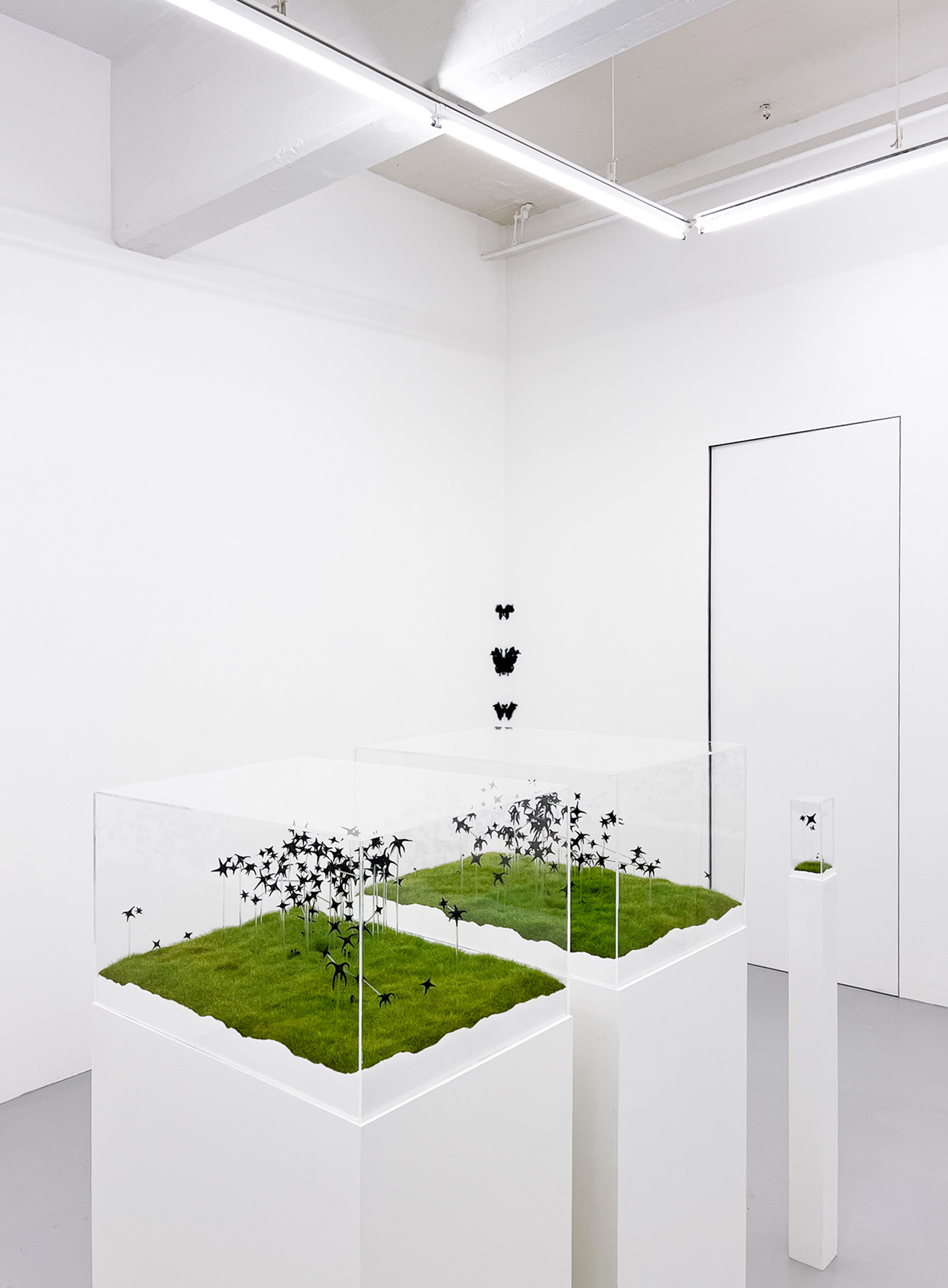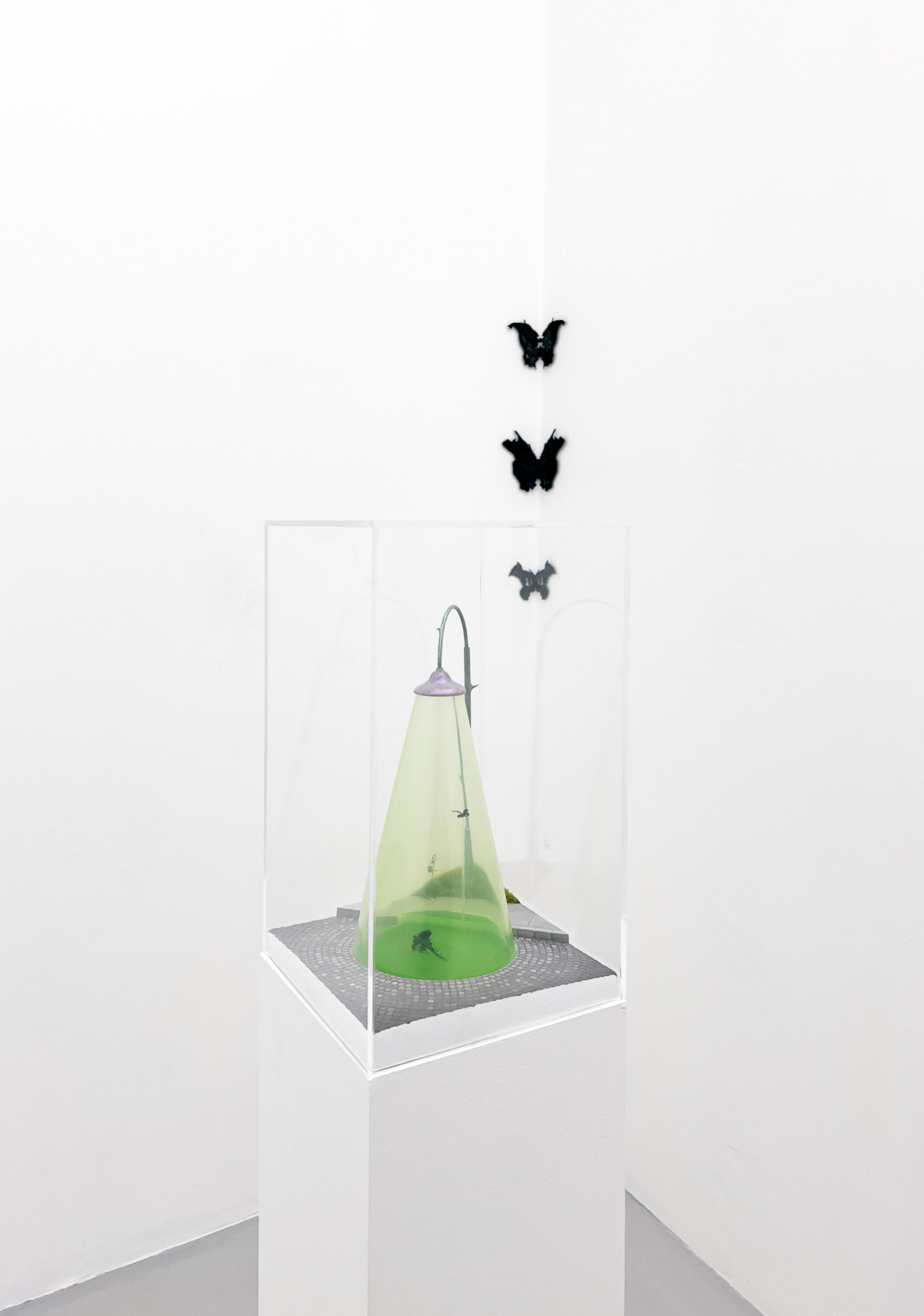 Christofer Degrérs första soloutställning på Coulisse Gallery, “incense, smoke, perfume, coffee, onions, alcohol, and the sea”, tar sin utgångspunkt i ett fragment: en telefonbild på en boksida med en lista av dofter och smaker. Utställningen rör sig kring fragment och brist, där rosor, stjärnor och fjärilar återkommer som tecken på det förlorade och det flyktiga. Med återkommande motiv, speglingar och språkliga skiftningar utforskas närvaro genom frånvaro. Instabilitet fungerar här som metod—konsten pekar mot helheten genom att visa på dess avbrott och brister.