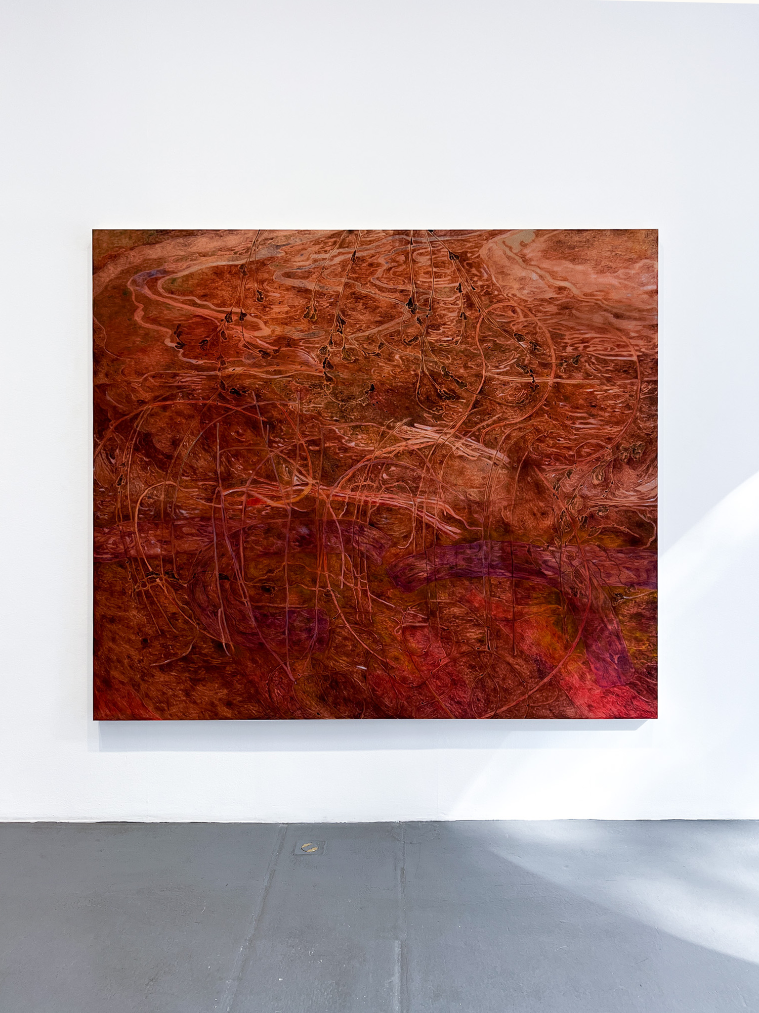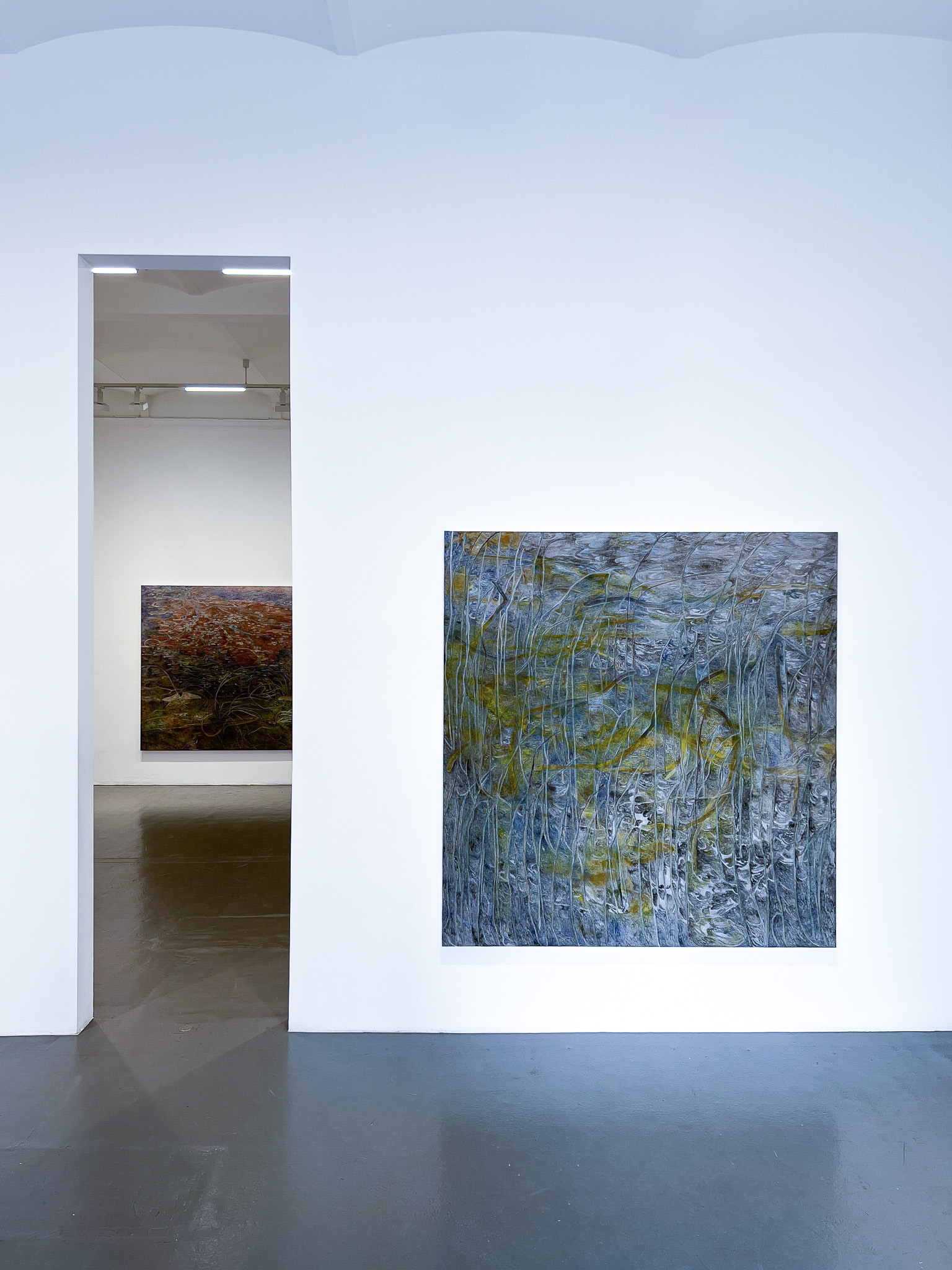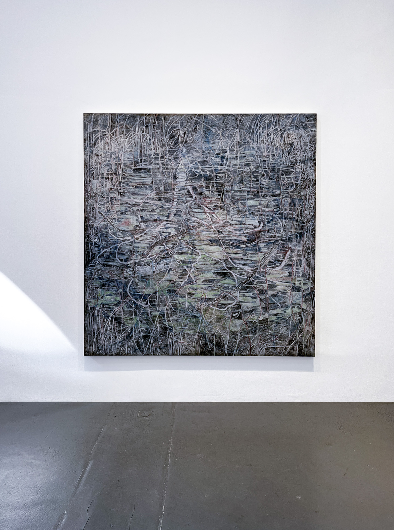 Utställningstiteln Sly fungerar på både svenska och engelska, och refererar till både motiv och uttryck. I Ebba Svenssons målningar möts betraktaren av ett membran som delar bilden i ett framför och ett bakom, där snårighet och rotsystem slingrar sig mot både yta och djup. Reflektioner och dubbla lager speglar en ständigt föränderlig verklighet. Hennes stora verk balanserar mellan föreställande och abstrakt, där materialiteten dominerar: oljefärgen förs på med korta penseldrag och skapar ett unikt, vibrerande måleriskt brus.