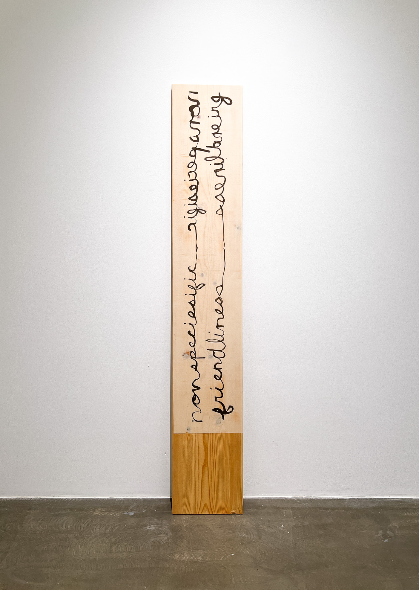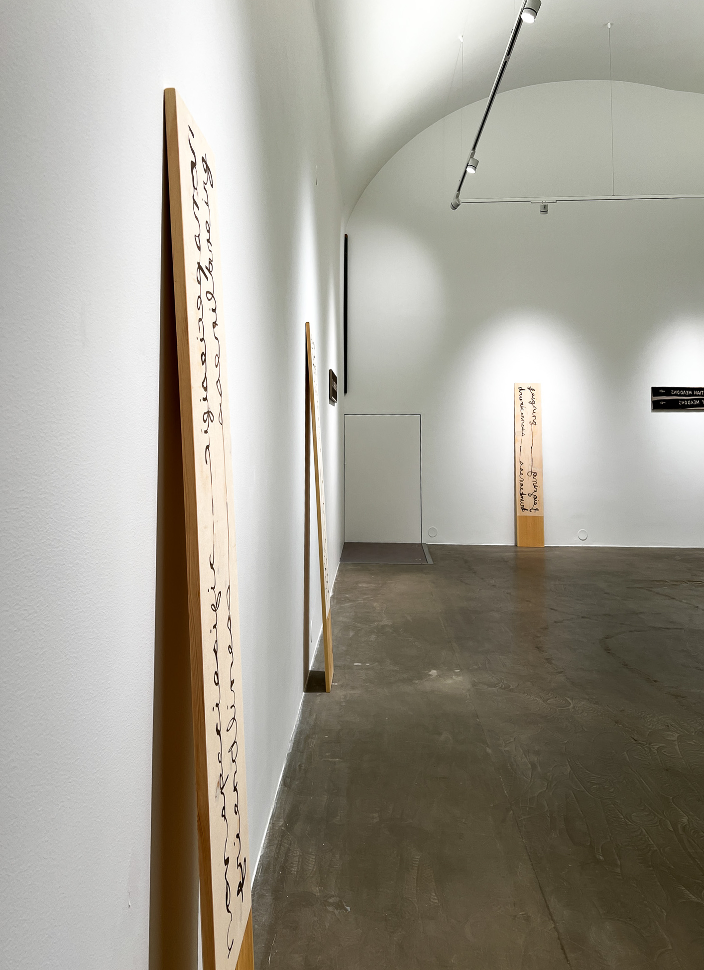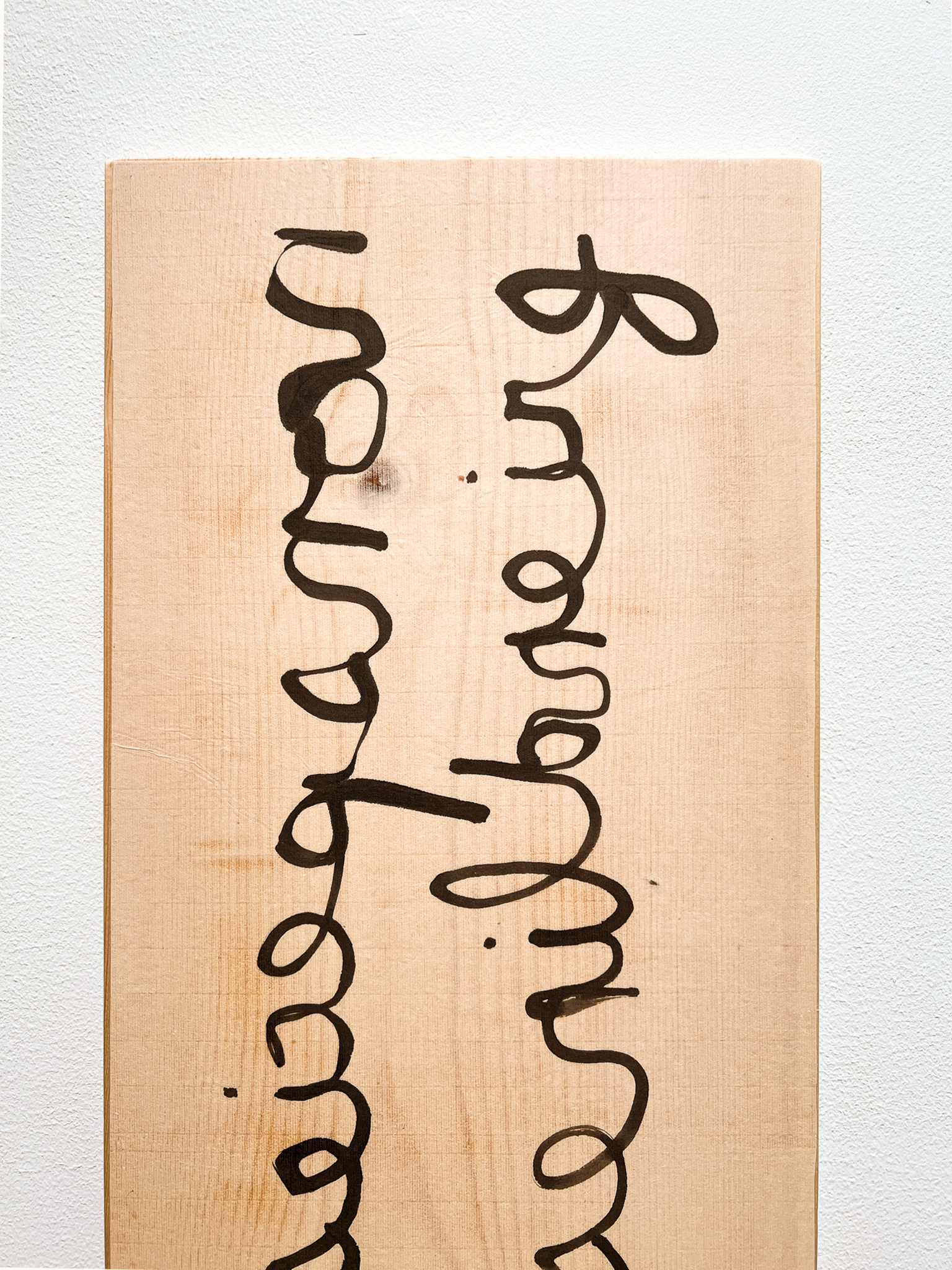 Efter nio års vävande gav jag 2021 bort mina vävstolar för att byta från detaljfokus till öppen närvaro. Vävningen var för bekant; jag ville återvända till icke-vetande. Kvar finns en stillsam lyhördhet för vardagen och en passion för planlöst vandrande. Några målningar återskapar oregelbundna träskyltar från Sierra Nevada, öppnande för platser bortom namn. Vertikala träplankor bär ”perifer kalligrafi” – två ord skrivna samtidigt framåt och bakåt med penslar i båda händer, havsliknande och lätta. Två readymades: en bit linjal funnen i Sydtyrolen och en grönmålad trästav från kliniken Waldau. Verken handlar om sinnlig närvaro, att leva tillfälligt, stilla och utan namn.