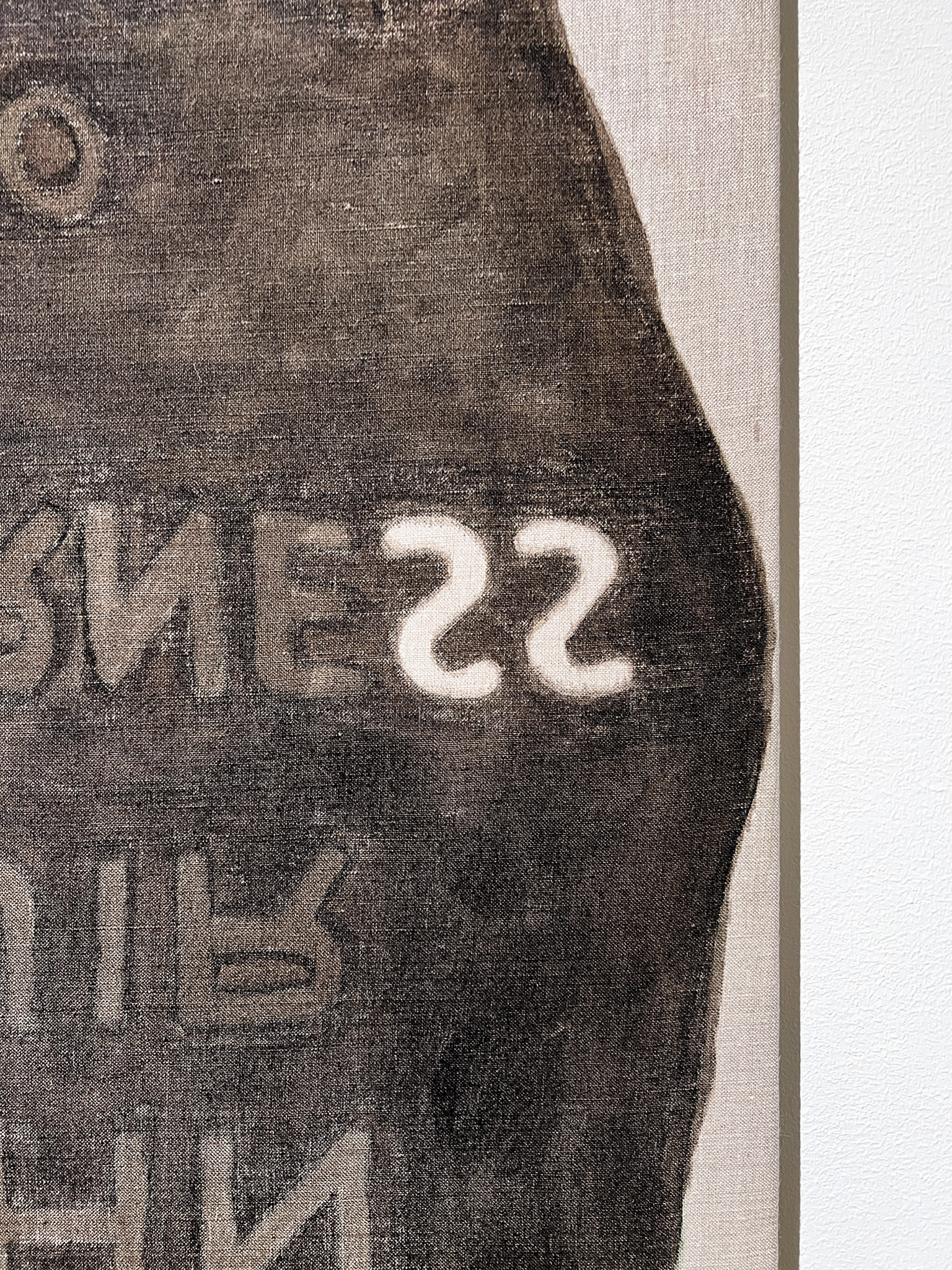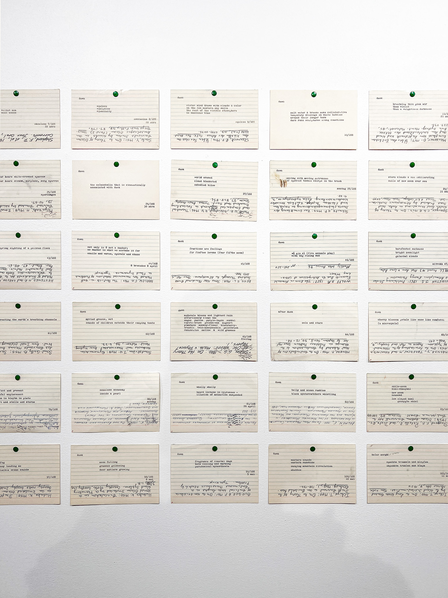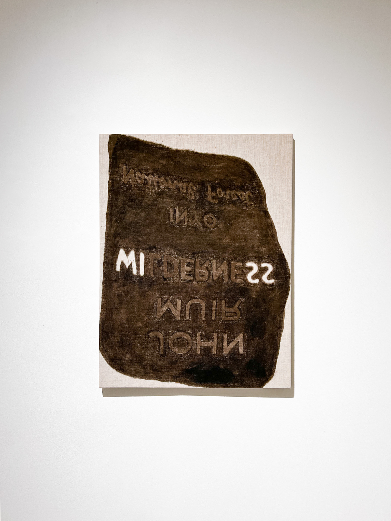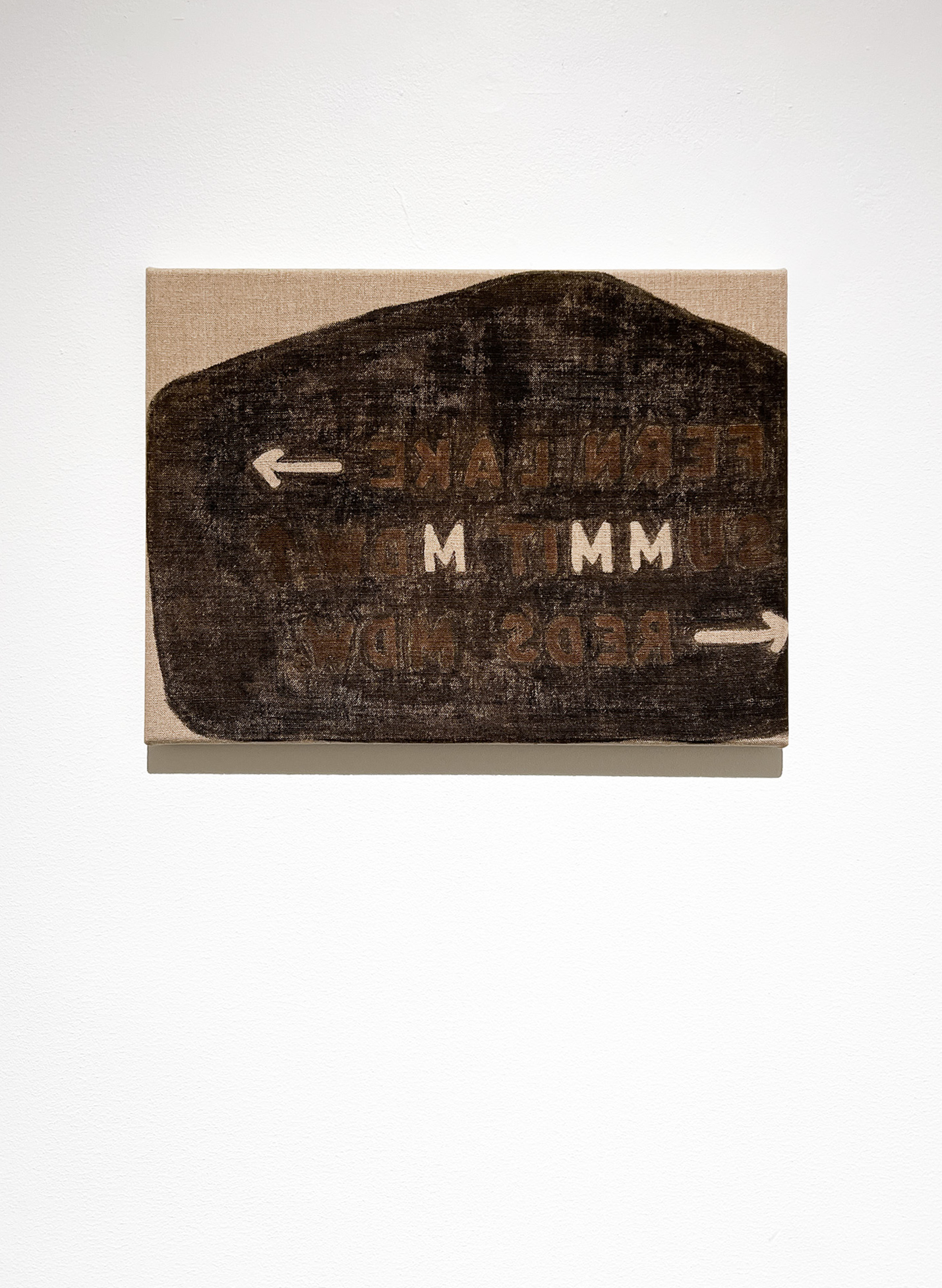 Efter nio års vävande gav jag 2021 bort mina vävstolar för att byta från detaljfokus till öppen närvaro. Vävningen var för bekant; jag ville återvända till icke-vetande. Kvar finns en stillsam lyhördhet för vardagen och en passion för planlöst vandrande. Några målningar återskapar oregelbundna träskyltar från Sierra Nevada, öppnande för platser bortom namn. Vertikala träplankor bär ”perifer kalligrafi” – två ord skrivna samtidigt framåt och bakåt med penslar i båda händer, havsliknande och lätta. Två readymades: en bit linjal funnen i Sydtyrolen och en grönmålad trästav från kliniken Waldau. Verken handlar om sinnlig närvaro, att leva tillfälligt, stilla och utan namn.