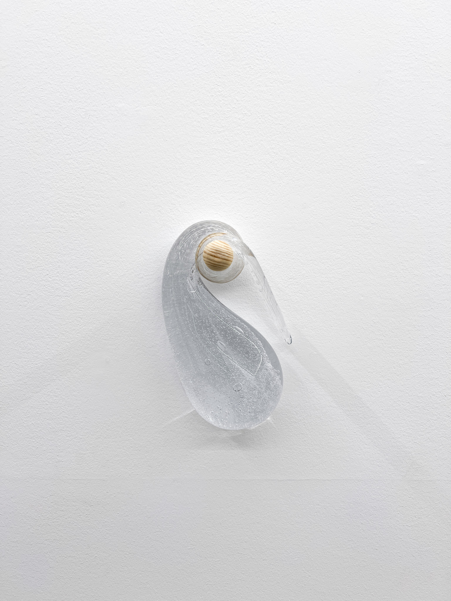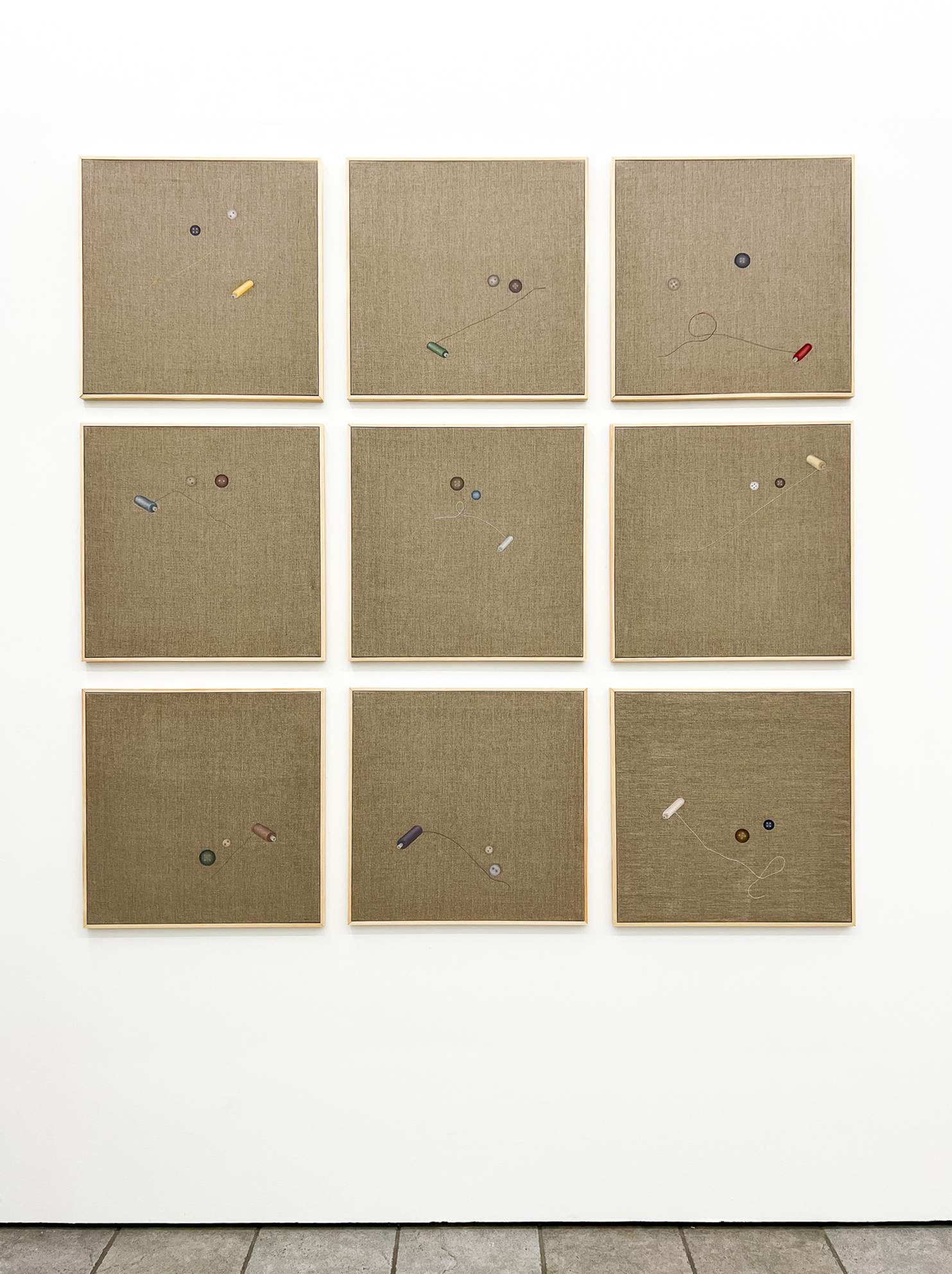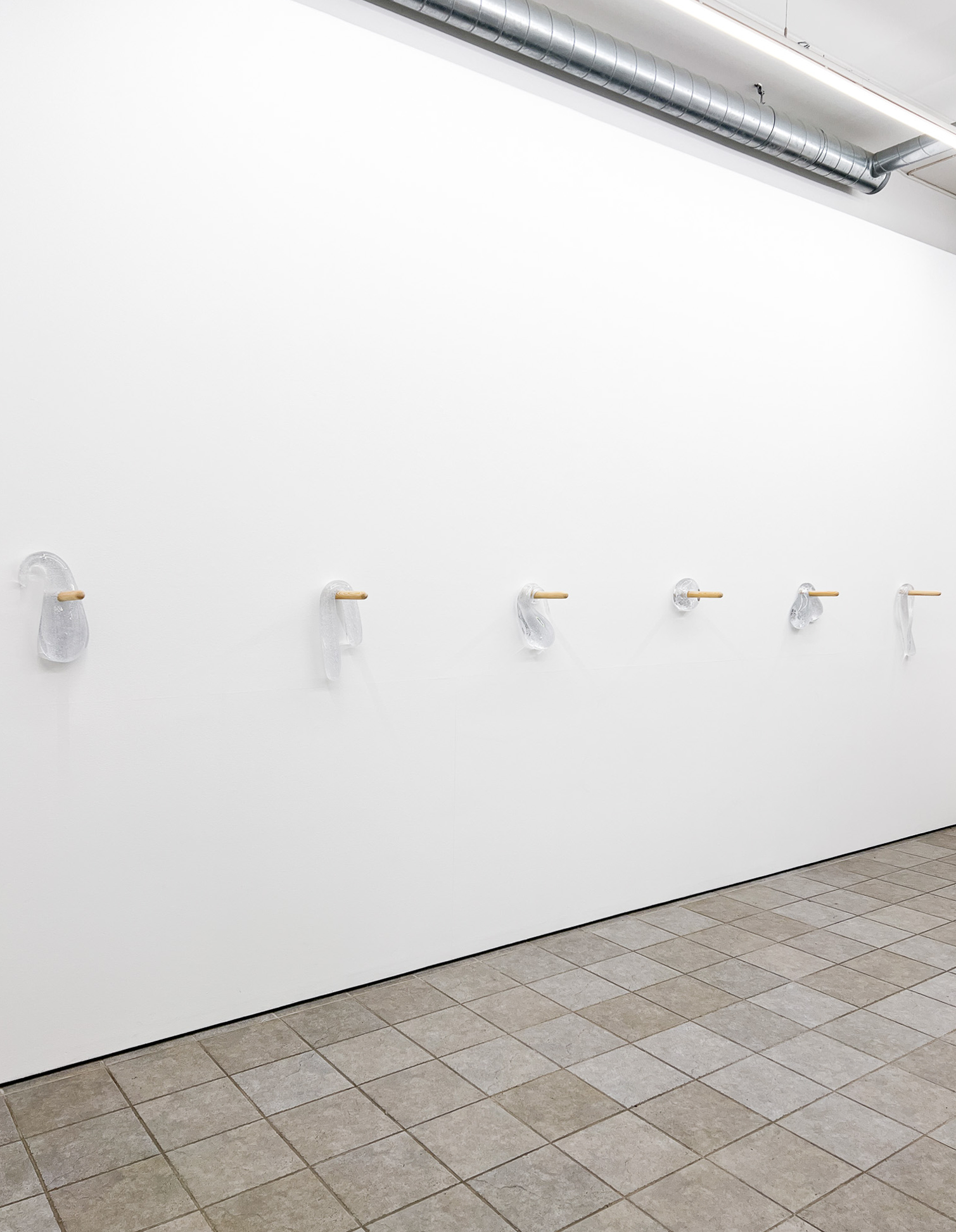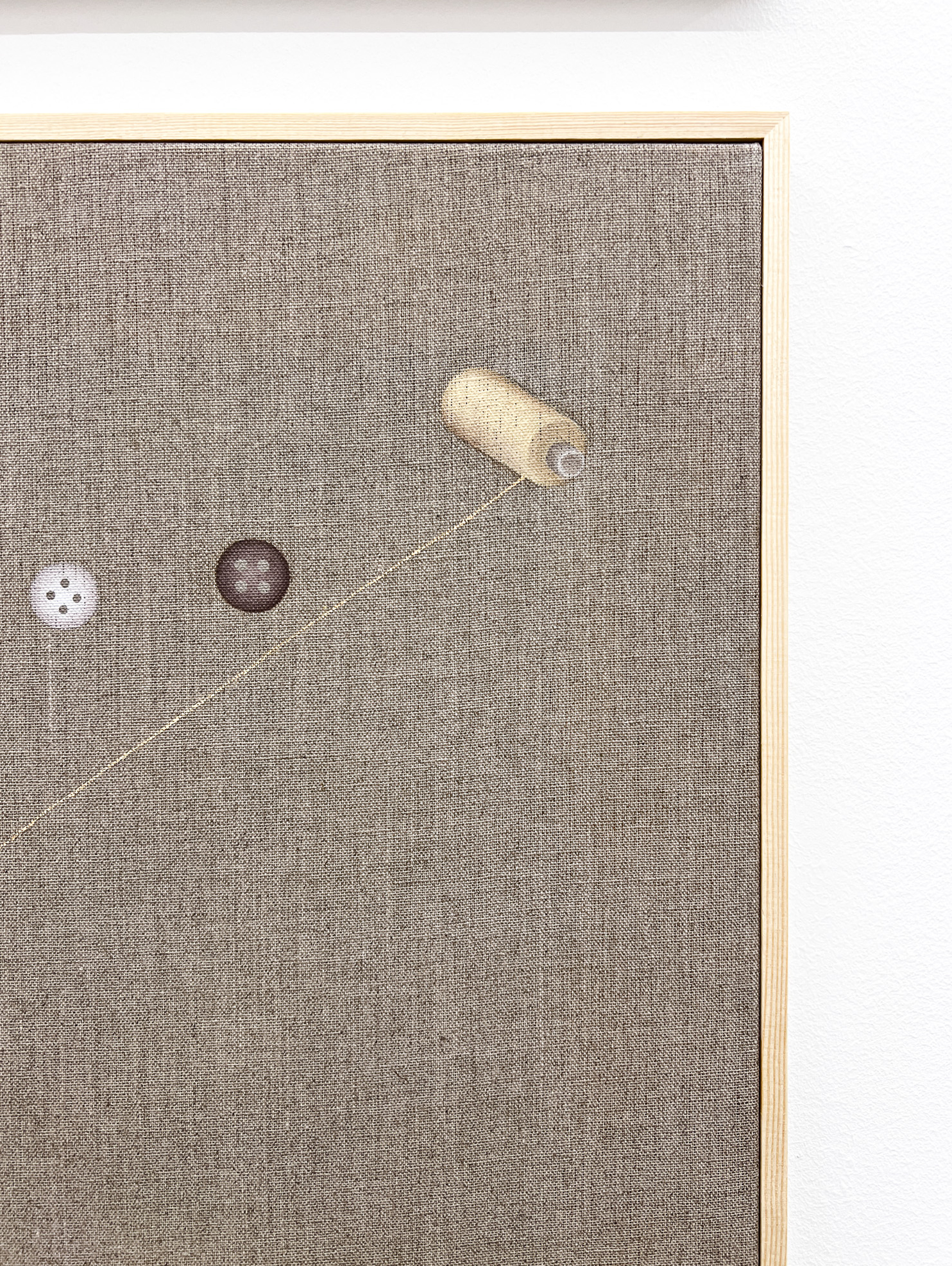 Utställningen Kissing the Shuttle av Militza Monteverde Burrau består av munblåsta glasskulpturer upphängda på träpluggar, målningar inspirerade av instruktionsritningar för vävstolar samt verk där knappar och trådrullar bildar ansiktsliknande motiv. Titeln refererar till en 1800-talsmetod där kvinnliga väverskor drog tråden genom skyttelns öga med munnen — en handling som felaktigt anklagades för att sprida sjukdomar, medan orsaken egentligen var deras ohälsosamma arbetsmiljö. Genom dessa objekt reflekterar Militza, med bakgrund inom textilkonst, över sitt eget konstnärliga arbete och dess villkor.