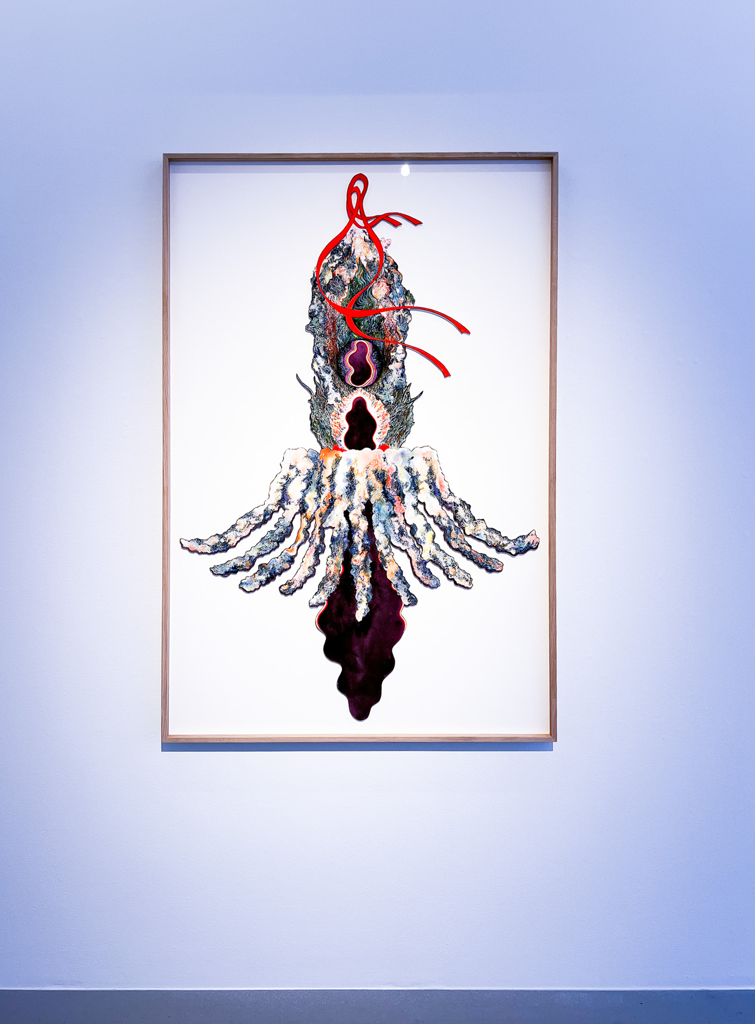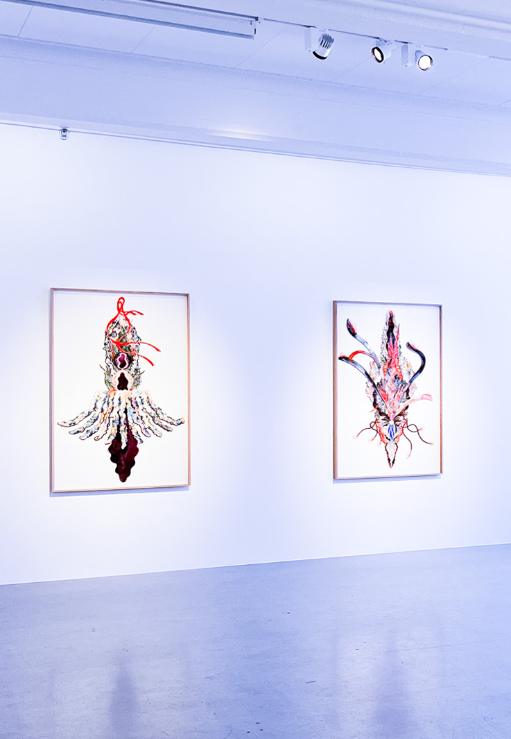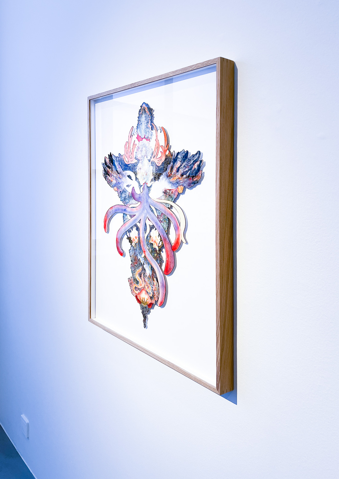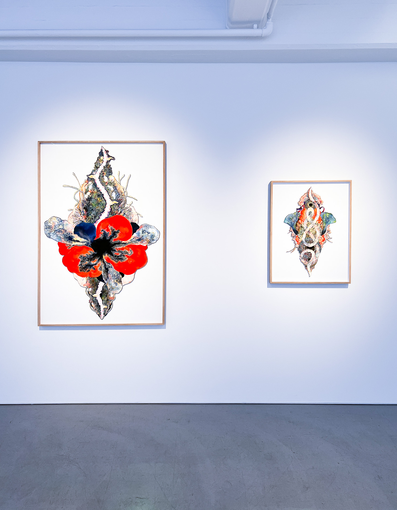 Olle Norås’ andra soloutställning Vid ängarna presenterar nya gouachemålningar där abstraktion möter naturens och andlighetens sfärer. De minutiöst uppbyggda verken rör sig mellan mikro- och makrovärldar och öppnar mot ett pulserande landskap. I detta nya skede närmar sig formerna figuration – gestaltlika närvaror som tycks stiga fram ur ett förlorat landskap. Med lysande, ofta psykedelisk färgskala och organiska strukturer undersöker Norås naturens kretslopp och gränstillståndet mellan det abstrakta och det igenkännbara.