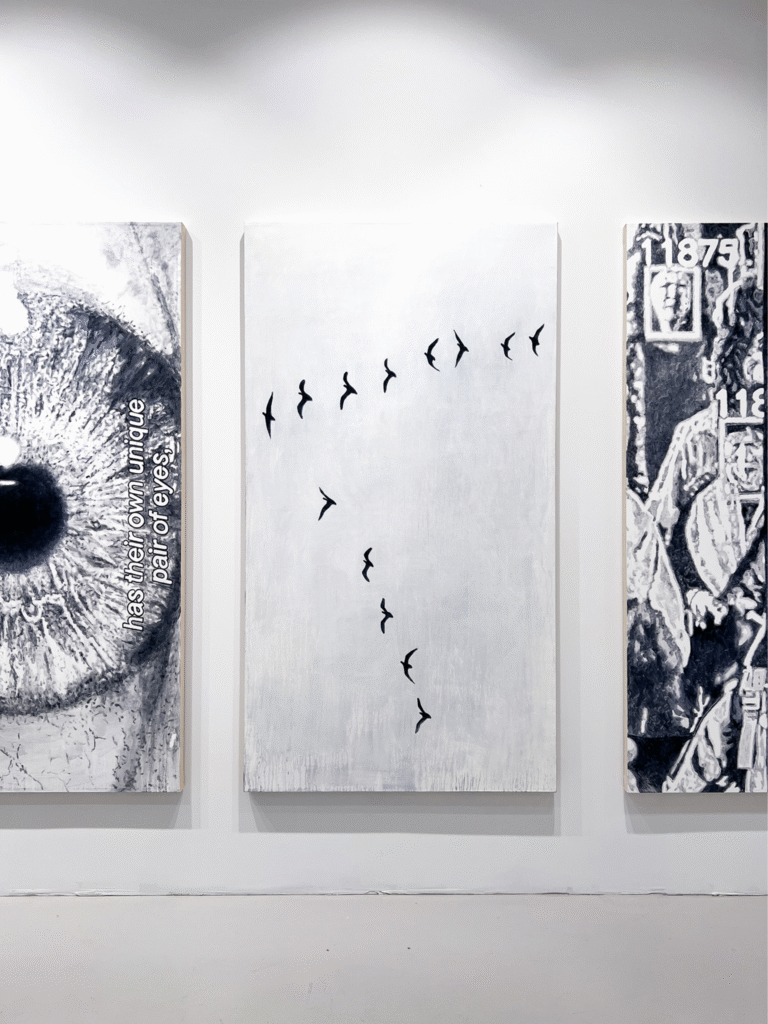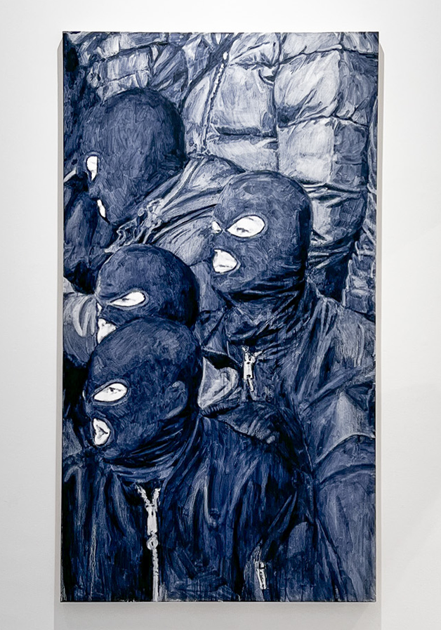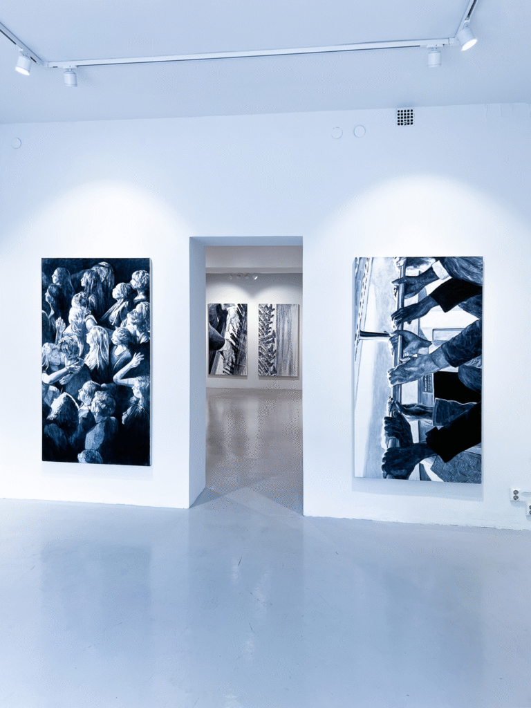 Redan utifrån gatan möts jag som betraktare av två målningar som konfronterar mig. Mellan målningarna är det ett tomrum, en passage in till ett annat rum av galleriet. Bilden till vänster om passagen avbildar ett folkhav som tycks vara en publik för någon form av föreställning, men som också föreställer ett par som kysser varandra. Den högra bilden avbildar händer som alla håller i en handstång på någon form av kommunalt färdmedel, möjligen tunnelbana eller buss. De två bilderna har en hel del slående likheter som kopplar dem samman, men ändå inte. Den ambivalenta relationen mellan Höglunds målningar är genomgående i utställningen och på så sätt blir de två första konfronterande målningarna (IMG_9110 och IMG_9745) lite som en introduktion till utställningen. Målningarnas förhållande till sin respektive – att ibland stöta emot eller reflektera mot varandra, antingen poetiskt, genom sina former eller innehåll. Det är också genom detta studsande mellan bildernas respektive som jag som betraktare skickas iväg som en pinball genom utställningen.